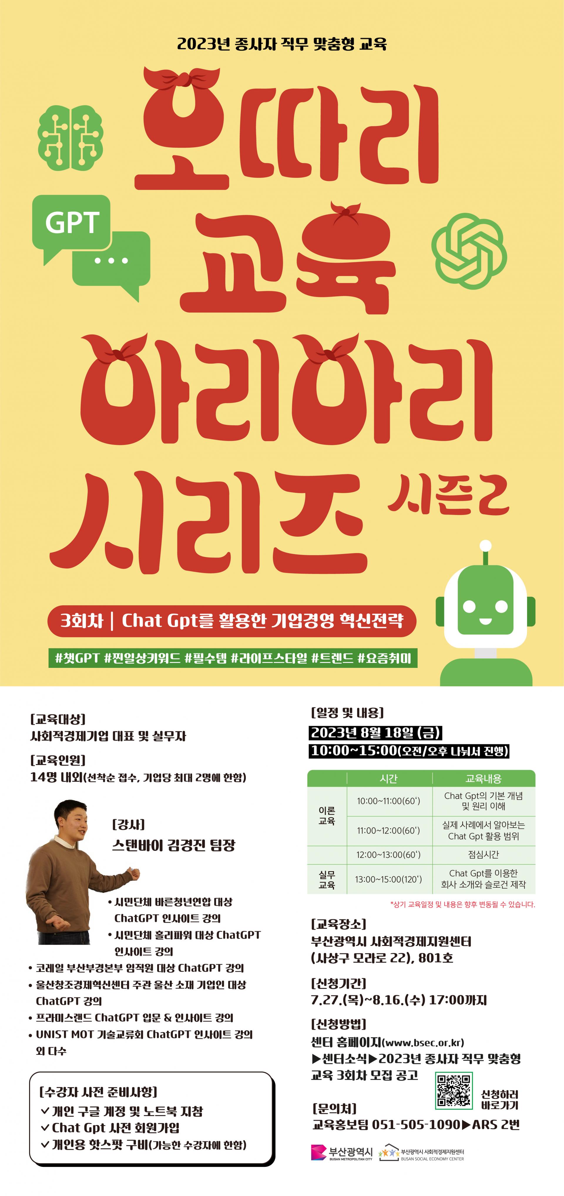 신청방법 : 센터 홈페이지(www.bsec.or.kr)-센터소식-2023년 종사자 직무 맞춤형 교육 3회차 모집공고